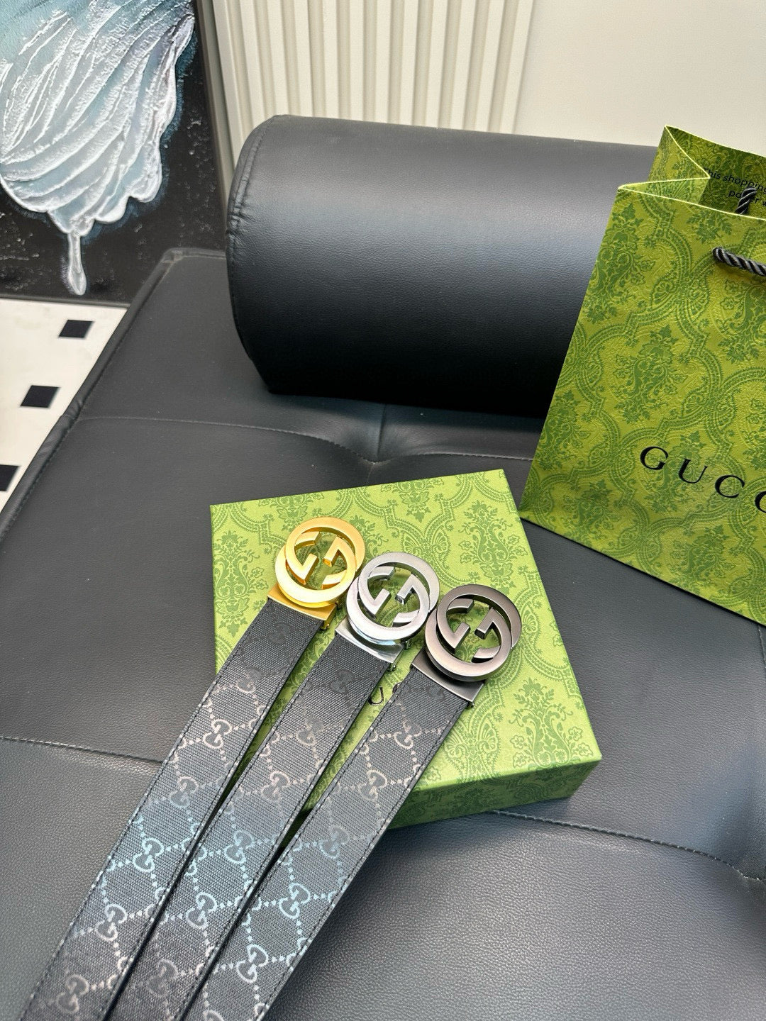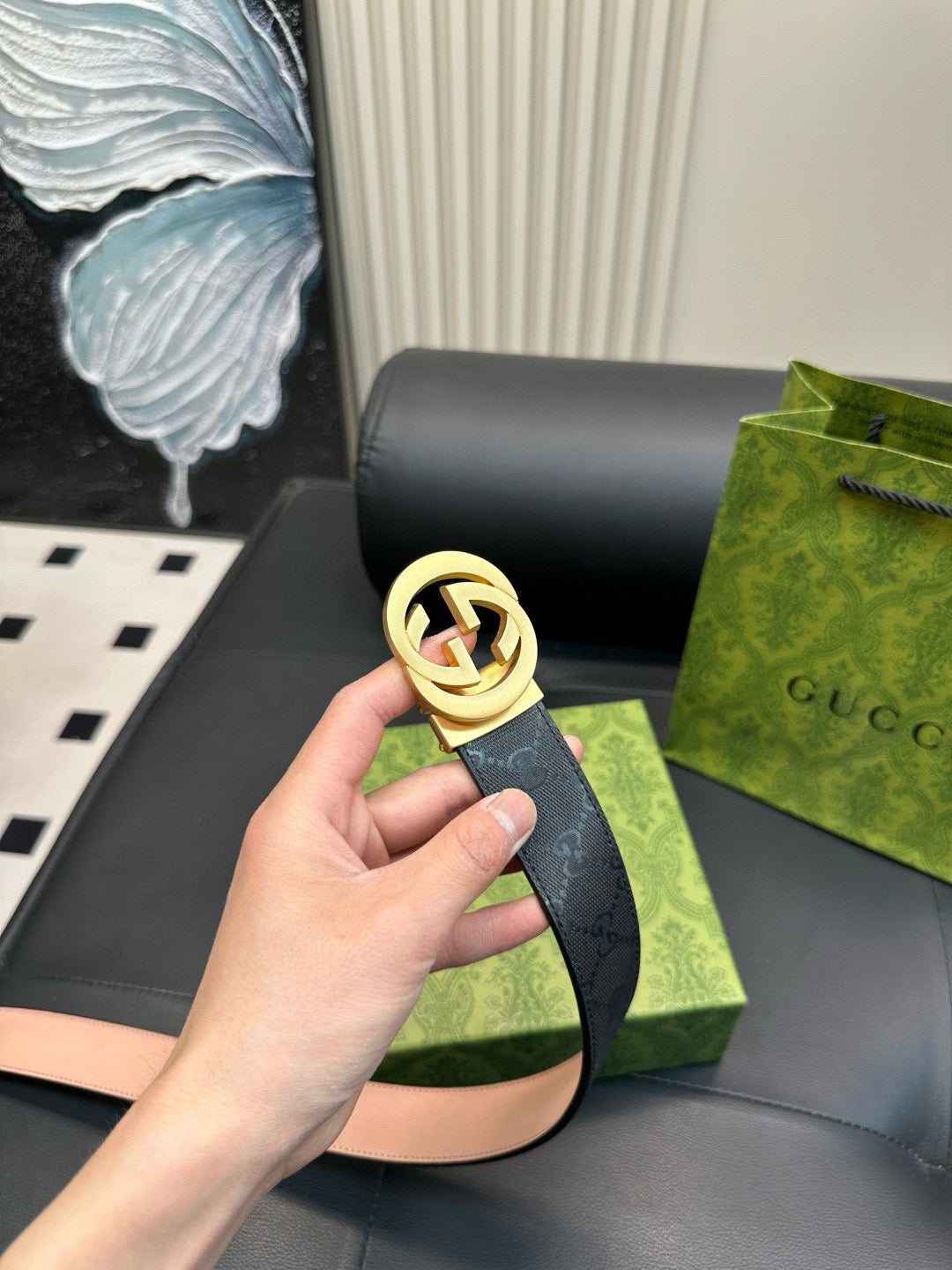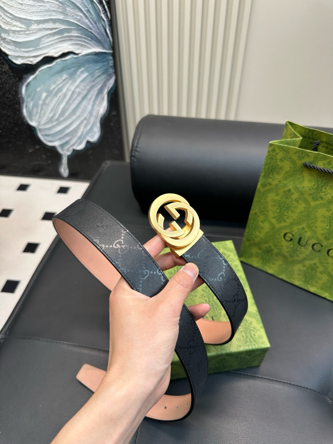 GG Matte surface, with printed pattern on the leather strap